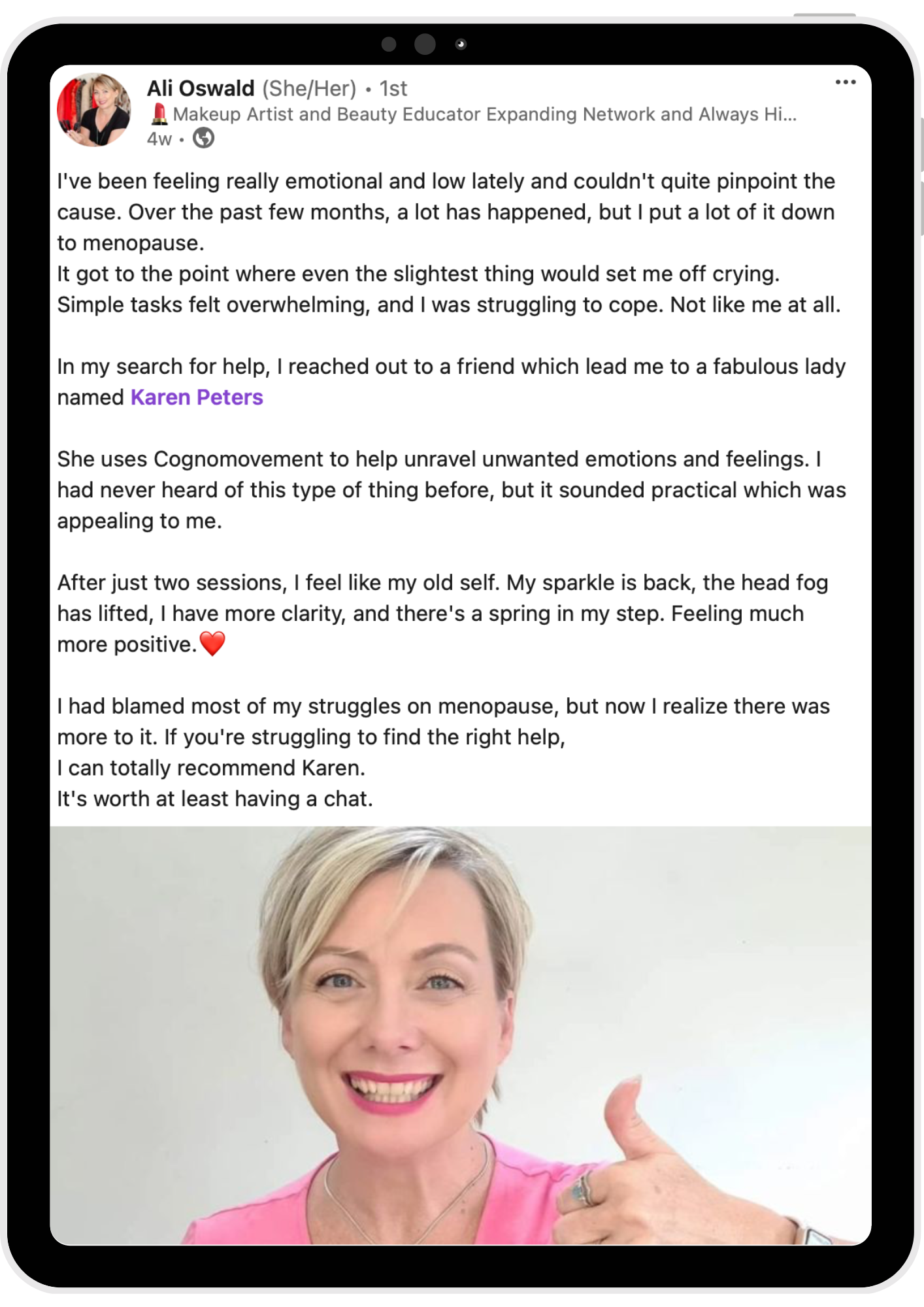 Karen is so understanding and patient (and good at dealing with tears!) I would recommend Cognomovement to anyone struggling with anything they can't shift.